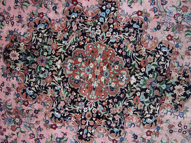This picture shows the central medallion of 300lines silk carpet 3z202255. The central medallion is brown and dark blue color.