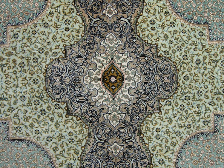This is the center of 400lines silk rug 4z94141. The main color is green. Flowers and Arabic vines are scattering in the central medallion.