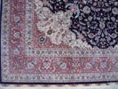 /10厘米左右,约90000结/平方米.高的可达到l700,000结/平方米.伊朗地毯的纬线也分粗,细纬,有的地方的地毯是双纬,但也有的地毯是单根纬线.伊朗人认为,地毯美观与否,很重要的因素在于颜色的搭配.伊朗使用的染料绝大部分是天然颜料,多用植物的果皮,根等,如核桃皮,橡树皮,石榴皮.制造这些颜料虽较复杂,困难,耗费时间,但产品美观,色彩协调,不褪色,极具地方色彩.