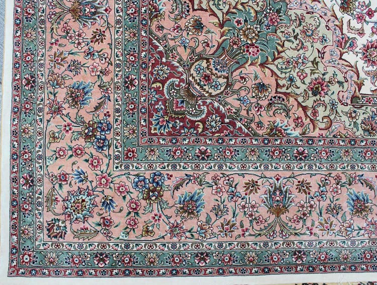 This picture shows the border of hand-made Persian silk carpet z185283. The main border color is brown. The inner bracket is red, brown and green.You can see the fringes, which are natural extentions of the silk warps.