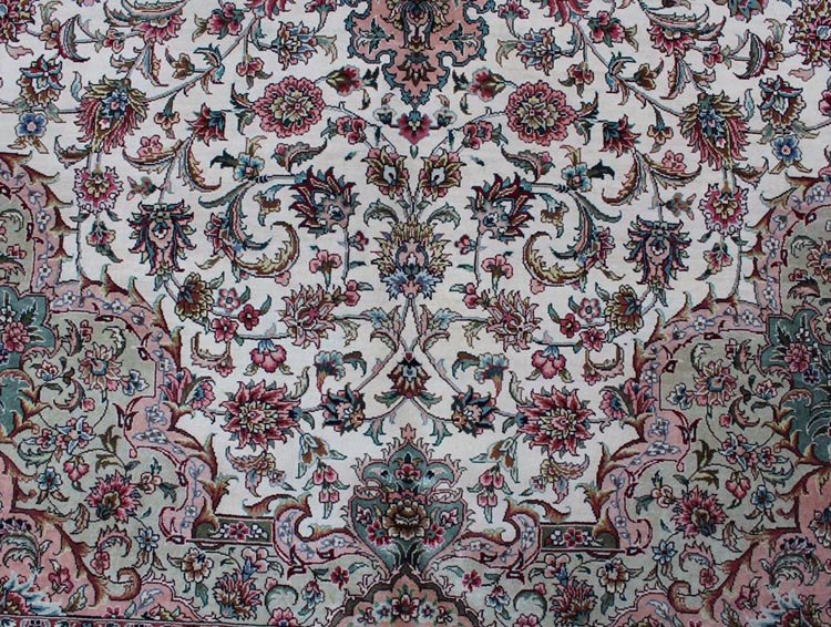This picture shows the field of 260lines Persian hand-made silk carpet z185283, The main color is white in the field. The petals and Arabic vines scatter in the field.